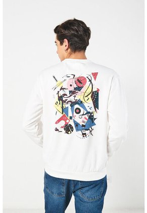 Buzo para hombre cuello redondo crema claro cuenta con puños y ruedo en rib, diseños artísticos coloridos en frente y espalda, hombro rodado y un fit ligeramente ajustado. Dale una pincelada diferente a tu look con esta prenda, combínala con un jean skinny y crea un outfit para disfrutar de tus planes casuales con amigos.