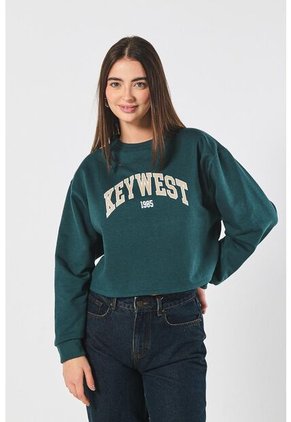 Buzo verde oscuro crop top para mujer cuenta con puños en rib, diseño college localizado en frente, manga larga amplia, cuello redondo y un fit ligeramente ajustado al cuerpo. Perfecto para los días fríos, podrás combinarlo con un jean push up y un par de tenis altos, así impactarás a los demás con tu estilo.