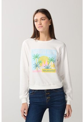 Buzo cuello redondo unicolor para mujer cuenta con ruedo y puños tejidos en rib, estampado playero localizado en frente, manga larga y una silueta ligeramente ajustada al cuerpo. Dale un toque llamativo a tu outfit con esta prenda, lúcela con un jean mom y vibra con tu estilo en todo momento.