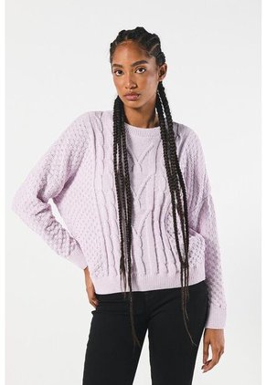 Suéter lila claro para mujer, confeccionado en suave material tejido, cuenta con detalles de trenzas localizados, cuello redondo, hombro rodado, manga larga y un fit ligeramente holgado. Infaltable para los días fríos, podrás combinarlo con tu mejor jean y crear un look de ensueño con el que te destaques.