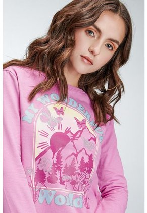Buzo cuello redondo para mujer en colores vivos con estampado en frente.
