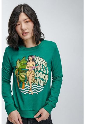 Buzo cuello redondo para mujer en colores vivos con estampado en frente, Hawái.