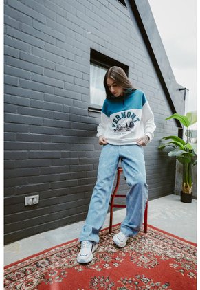Buzo crema claro cuello alto para mujer cuenta con detalle con corte verde en la parte superior, puños y ruedo en rib, cierre con cremallera, diseño college en frente, hombros rodados y una silueta holgada. Llena tu total look con una vibra universitaria combinando esta prenda con tus jeans favoritos. ¡Te verás fenomenal!