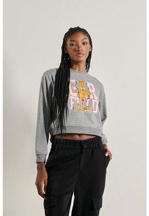 Buzo cuello redondo para mujer en tono gris claro cuenta con borde inferior y puños tejidos en rib, diseño de Garfield localizado en frente y un fit ceñido a la silueta del cuerpo. Crea un look atractivo combinando esta prenda con un jean push up, será ideal para salir de compras con tus amigas.