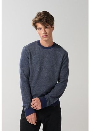Suéter azul oscuro para hombre, confeccionado en suave material tejido, cuenta con cuello redondo, manga larga y un fit ajustado a la silueta del cuerpo. Esta es una prenda atemporal e infaltable que podrás combinar con tus jeans favoritos y lucir en tu próxima salida con amigos.