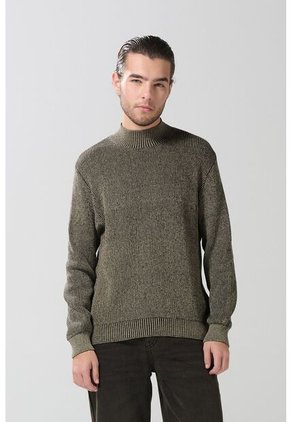 Suéter kaki para hombre, elaborado en material tejido, cuenta con cuello alto, manga larga, detalles con finas texturas de canal y una silueta ajustada al cuerpo. Crea outfits en tendencia con esta prenda, combínala con un jean slim y lúcela para los climas fríos o días lluviosos.