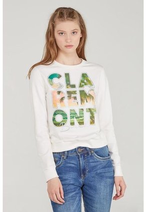 Buzo para mujer, en tela de cuerpo unicolor, estampado frontal en contraste, manga larga y cuello redondo