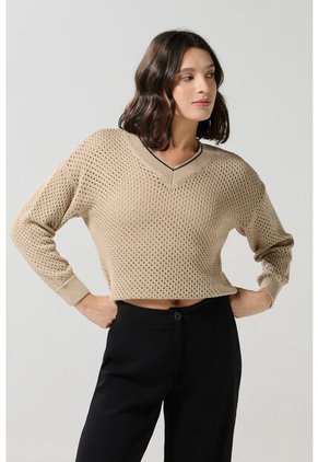 Suéter para mujer en tono kaki claro, confeccionado en material tejido, cuenta con cuello V en contraste, manga larga, detalles con perforaciones y un fit ajustado al cuerpo. Encuentra una nueva forma de proyectarte al mundo con esta prenda, combínala con tu mejor jean y lúcela para disfrutar de una tarde con amigas.