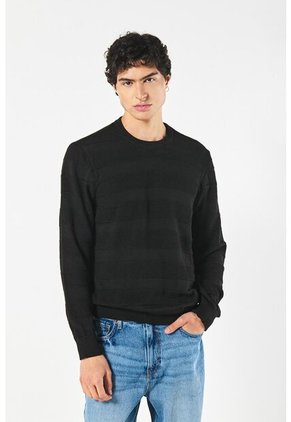 Suéter para hombre en tono negro, confeccionado en suave material tejido, cuenta con cuello redondo, franjas localizadas y una silueta ajustada al torso. Esta es una prenda en tendencia perfecta para los planes casuales, con un jean skinny crearás un look con el que te sentirás identificado.