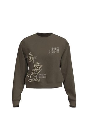 Buzo cuello redondo para mujer en tono verde oscuro cuenta con ruedo y puños tejidos en rib, diseño de Silvestre y Piolín (Looney Tunes) y un fit ligeramente ajustado al cuerpo. Esta prenda revolucionará tu armario, combínala con tus jeans favoritos y lúcela cualquier día de la semana.