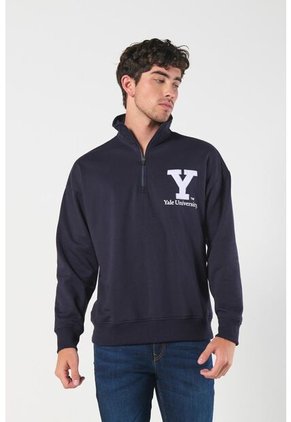 Buzo cuello alto azul intenso para hombre cuenta con puños y ruedo tejidos en rib, manga larga, hombro caído, diseño de Yale en frente, cierre con cremallera en pechera y una silueta oversize. Esta es una prenda súper versátil con la que podrás crear cientos de combinaciones para lucir en tus planes cotidianos.