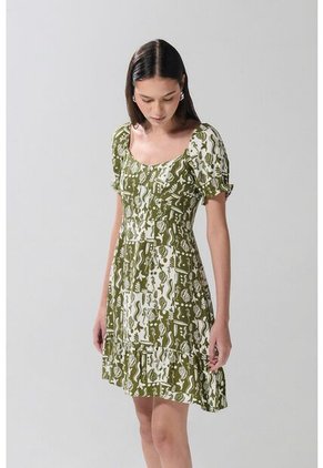 Vestido corto para mujer en tono verde claro, elaborado en tela fresca de rayón, cuenta con manga corta aglobada, elástico en puños, pieza encauchada en la espalda, diseños estampados y un fit ajustado. Cualquier día será perfecto para vestir esta prenda, combínala con tus accesorios favoritos y crea looks tan únicos como tú.