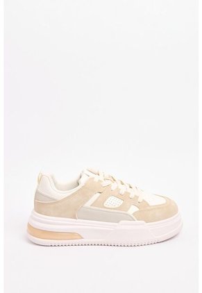 Tenis urbanos femeninos en color crema con en color contraste kaki, esta composición de colores es un básico de la temporada ya que te permiten crear looks versátiles, su diseño es una interesante mezcla de 2 cosas que amas inspirado en el estilo skateboard, un clásico del diseño con suela de plataforma cuenta con agujeros de ventilación frontales, este calzado es perfecto para tus looks del día