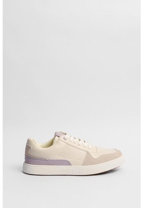 Tenis para mujer tipo casuales cremas claros cuentan con suelas planas, sistema de cierre con cordones, texturas en los costados y contrastes de color localizados. Esenciales para tus pies, podrás combinarlos con tus atuendos preferidos y llevar la comodidad al caminar. ¡No vas a querer quitártelos!