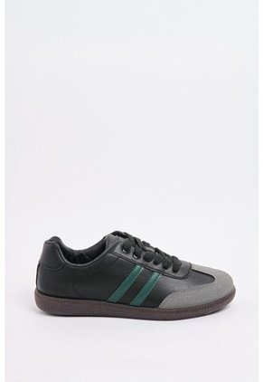 Tenis negros casuales para hombre cuentan con cierre de cordones, diseños con franjas verdes en los costados, ojaletes metálicos, detalles con cortes localizados y suelas planas. Lleva la suavidad en tus pies combinándolas con tus atuendos diarios, así te sentirás cómodo en cada paso que des.