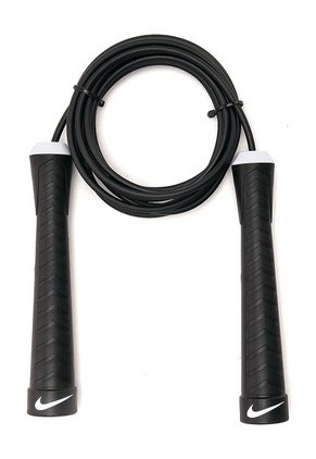 Lazo Negro-Blanco Nike Speed Rope diseño Training elaborado en plástico con el logo y nombre estampado en los agarres. cuentan con un sistema de rodamiento independiente que facilita al atleta alcanzar altas velocidades. La guaya delgada corta el viento ayudando a hacer saltos dobles. Su medida es: 23 metros.
