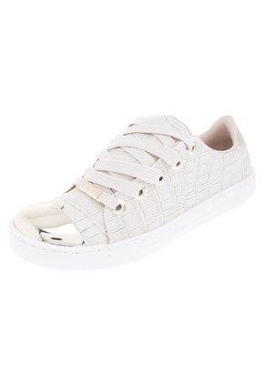 Lifestyle beige Moleca, elaborado en sintético, diseño informal de textura lisa a un tono con efecto reptil, revestimientos dorados/detalle alusivo a la marca que