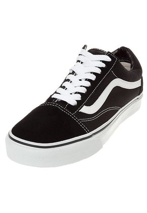 Lifestyle Vans de color negro, elaborados en cuero en la parte delantera y atrás del zapato, en los costados esta elaborado en textil con unas bandas en cuero liso de color blanco con