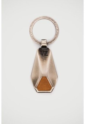 Llavero Martinno con cuero para hombre, elaborado en zamak con efecto de plata quemada y textura grabada en la parte posterior; detalle geométrico en cuero, ideal para el día a día, producto con el sello de calidad y lujo artesanal de Vélez.