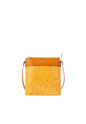 El amarillo quemado, ese que recuerda el color de la mostaza Dijón, le pone un toque otoñal a esta versión de la colección emblemática de la marca, que hace que las mariposas resalten sobre el piel, gracias a un efecto "quemado", creado manualmente en Italia mediante una técnica conocida como tamponado. El tono protagonista contrasta, y a la vez se complementa de manera armoniosa, con un cuero liso canela que baña las manijas y la base de carteras y billeteras.