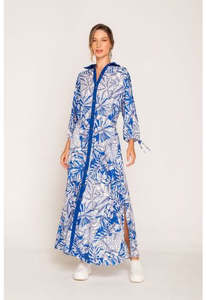 Vestido camisero estampado con perilla y cuello en contraste. Silueta amplia con corte en cintura y prenses decorativos. Mangas tres cuartos con tiras de ajuste en puño. Una prenda versátil que puede usar como vestido o kimono sobre puesto.