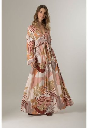 Los volúmenes holgados, generan confort y dinamismo en tus prendas. Nuestro maxi vestido estampado con mangas largas y embombadas, tiene boleros y escote pronunciado además del toque femenino que le da el estampado de inspiración natural. Ideal para un look casual y fresco.