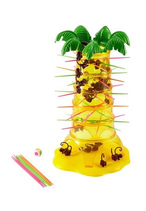 Este juego de habilidad y toque es tan fácil de aprender y tan divertido de jugar ¡que los niños harán monerías por jugarlo! El propósito es no dejar que ningún mono caiga del árbol mientras es tu turno. Crea una red de palitos de colores a través del árbol y pon a los monos dentro de él. Después tira el dado y tomen turnos para quitar un palito a la vez—del color que indique el dado.
