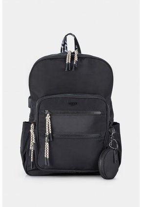 Bolso tipo tula morral en Textil para mujer, Diseño con bolsillo removible que se convierte en bandolera. Es una referencia con silueta moda con muchos detalles como cargaderas estampadas, marcacion metalica pintada, jaladeras tipo cordon y llavero de moda removible. Diseño con capacidad para portatill de 15 pulgadas, sistema USB en el lateral, tira de trolley y bolsillo secreto en la parte trasera. Forro estampado interno con compartimentos para guardar objetos de uso cotidiano. Ideal para ocasiones de uso informal y oficina.Es un diseño dos en uno