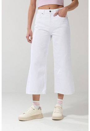 Jean blanco tipo culotte para mujer cuenta con tiro alto, pretina sencilla con botón metálico, bota ancha corta, cierre con cremallera oculta en frente y una silueta holgada en el cuerpo. ¡Esta prenda será tu opción favorita! Con una blusa manga sisa y un par de tenis altos crearás un outfit ideal para los días soleados.