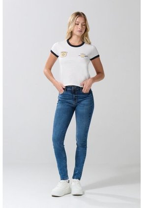Jean push up para mujer en tono azul claro cuenta con pretina sencilla con botón metálico, realce posterior con pinzas, 5 bolsillos, tiro alto y un ajuste ceñido al cuerpo. Esta prenda será ideal para llevar con una blusa crop top a cualquier ocasión, desde una salida casual hasta una reunión formal.