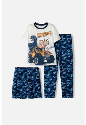 Pijama para niño. Pijama paquete por tres, camiseta cuello redondo manga corta, pantalón con cintura elastica y ruedo en botas, pantalon corto tipo bermuda con cintura elastica -tela algodón para mayor frescura y suavidad -elastico para mayor ajuste,cuello con elongación para facilitar el paso de la cabeza Color: Azul/marfil. Con diseño de Mic. Licencia oficial de Mic. Material: componente: camiseta , composición: 99% algodón, 1% elastano componente: pantalon , composición: 100% algodón .