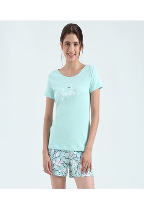 Conjunto de pijama para mujer, camiseta manga corta con estampado al frente, cuello redondo y silueta semi-ajustada, short corto con estampado de flores, cómoda y suave con el tacto, ideal para un descanso fresco y confortable. ¡agrégala ahora al carrito de compras!Especificaciones:Color MentaComposición: Poliéster 65% Algodón 35%Instrucciones de Lavado:No dejar en remojoLavar en agua fría separadamenteNo usar blanqueadorNo retorcerSecar a la SombraPlancha tibiaHecho en ColombiaFabricado por: Manufacturas Eliot SASGarantía: 30 Días.