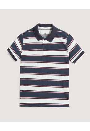 Polo para niño con diseño de rayas en tonos azul, blanco y acentos rojos. Cuello clásico tejido en contraste oscuro. Tapeta frontal con botones. Manga corta con terminación en rib acanalado. Confeccionado en tejido suave y fresco que aporta comodidad.Especificaciones:Color: AzulComposición: 65% Poliéster 35% AlgodónTipo de manga: Manga CortaInstrucciones de Lavado:No dejar en remojoLavar en agua fría separadamenteNo usar blanqueadorNo retorcerSecar a la SombraPlancha tibiaHecho en Colombia