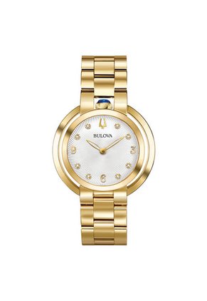 - • Marca: Bulova• Modelo: 97P125• Colección: Rubaiyat• Genero: Mujer• Color de esfera: Dorado• Color del pulso: Dorado• Material del Pulso: Acero Inoxidable• Cristal: Mineral• Diametro de Caja: 35mm• Material de Caja: Acero Inoxidable• Espesor de Caja: 35mm• Movimiento: Cuarzo• hasta una presión 50 mts• Tipo de Cierre: Mariposa• Garantía: 24 MESES SOBRE MAQUINARIA UNICAMENTE.NO CUBRE: *Uso inadecuado por parte del comprador, Golpes y/o mala manipulación del producto. *No aplica para daños, deterioro o cambio de pulso.*No aplica para coronas y/o cristales.