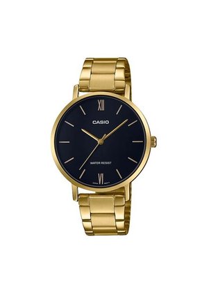 Hermoso Reloj CASIO analogo para mujer, 100% orignal y garantizado, este reloj cuenta con un cristal elaborado en mineral, su tablero de color negro, pulso dorado elaborado en acero inoxidable, cuenta con caja en acero inoxidable dorado la cual tiene un diametro de 40×34×7.9mm, el tipo de cierre de este reloj es broche, su moviemineto es quartz, tiene una resistencia al agua de 30 mts y cuenta con un año de garantia sobre maquinaria unicamente.