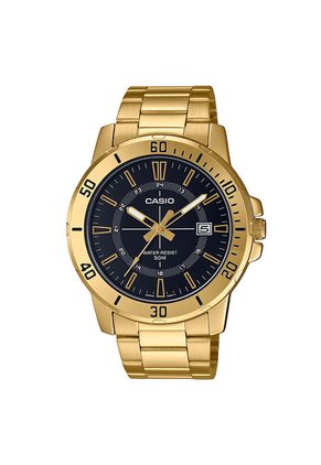 - • Marca: Casio• Modelo: MTP-VD01G-1CVUDF• Colección: Core Mens• Genero: Hombre• Color de la caja: dorado• Color del pulso: dorado• Material del Pulso: Acero Inoxidable• Cristal: Mineral• Diametro de Caja: 45mm• Material de Caja: Acero Inoxidable• Espesor de Caja: 10.3mm• Movimiento: Cuarzo• Resistencia al agua: 5 bar - 50mts• Tipo de Cierre: Desplegable• Garantía: 12 MESES SOBRE MAQUINARIA UNICAMENTE.NO CUBRE: *Uso inadecuado por parte del comprador, Golpes y/o mala manipulación del producto. *No aplica para daños, deterioro o cambio de pulso.*No aplica para coronas y/o cristales.