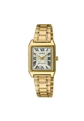 Reloj casio LTP-V007G-9B Analogo para mujer su caja de color Dorado elaborado en Acero inoxidable, la caja tiene un tamaño de 31×22×7.5mm, su tablero de color champana, cristal en Mineral, su hermoso pulso en Acero inoxidable de color Dorado, tipo de cierre es de Broche, su movimiento es quartz, tiene resistencia al agua de 50 mts y cuenta con un año de garantia sobre maquinaria unicamente.