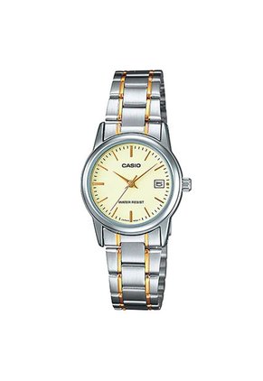 - • Marca: Casio• Modelo: LTP-V002SG-9AUDF• Colección: Core Ladies• Genero: Mujer• Color de la caja: Plateado• Color del pulso: Bicolor• Material del Pulso: Acero Inoxidable• Cristal: Mineral• Diametro de Caja: 25mm• Material de Caja: Acero Inoxidable• Espesor de Caja: 9.5mm• Movimiento: Cuarzo• Resistencia al agua: 5 bares (50 metros)• Tipo de Cierre: Desplegable• Garantía: 12 MESES SOBRE MAQUINARIA UNICAMENTE.NO CUBRE: *Uso inadecuado por parte del comprador, Golpes y/o mala manipulación del producto. *No aplica para daños, deterioro o cambio de pulso.*No aplica para coronas y/o cristales.