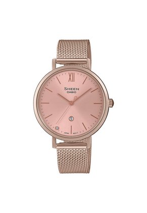 - • Marca: Casio• Modelo: SHE-4539CM-4AUDF• Colección: Sheen• Genero: Mujer• Color de esfera: Oro Rosa• Color del pulso: Oro Rosa• Material del Pulso: Acero Inoxidable• Cristal: Mineral• Diametro de Caja: 34mm• Material de Caja: Acero Inoxidable• Espesor de Caja: 6,4mm• Movimiento: Cuarzo• Resistencia al agua: 5 bares (50 metros)• Tipo de Cierre: Desplegable• Garantía: 12 MESES SOBRE MAQUINARIA UNICAMENTE.NO CUBRE: *Uso inadecuado por parte del comprador, Golpes y/o mala manipulación del producto. *No aplica para daños, deterioro o cambio de pulso.*No aplica para coronas y/o cristales.