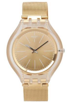 Reloj Dorado-Transparente Swatch, elaborado en acero inoxidable y