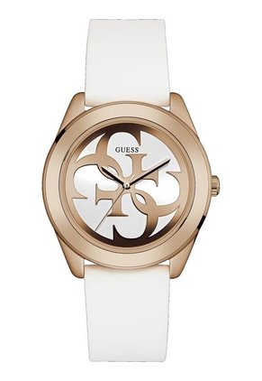Reloj de pulso Guess G Twist - Blanco/Oro-Rosa W0911L5 para mujer con movimiento analógico, con caja en acero inoxidable,y un diámetro de 38 mm. Tablero y pulso blanco. Con una caja espectacular en color Oro-Rosa y diales en el mismo tono que resaltan el logo de Guess. Distribuidores directos y autorizados para Guess en Colombia.