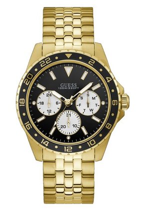 Reloj de pulso Guess Odyssey - Dorado W1107G4 para hombre con movimiento analógico, caja en acero inoxidable ,y un diámetro de 44mm. Tablero negro y pulso dorado en acero. Con una caja espectacular en color oro y diales en el mismo tono resaltan el logo de Guess. Distribuidores directos y autorizados para Guess en Colombia.