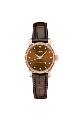 - • Marca: Mido• Modelo: M7600.3.64.8• Colección: BARONCELLI II• Genero: Mujer• Color de esfera: oro rosa• Color del pulso: café• Material del Pulso: Cuero• Cristal: Zafiro• Diametro de Caja: 29mm• Material de Caja: Acero inoxidable• Espesor de Caja: 8,65mm• Movimiento: Automatico• Resistencia al agua - solo salpicaduras - No sumergible• Tipo de Cierre: Mariposa• Garantía: 24 MESES SOBRE MAQUINARIA UNICAMENTE.NO CUBRE: *Uso inadecuado por parte del comprador, Golpes y/o mala manipulación del producto. *No aplica para daños, deterioro o cambio de pulso.*No aplica para coronas y/o cristales.