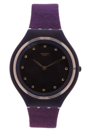 Reloj morado Swatch, elaborado en cuero, diseño casual de
