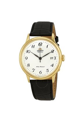 Reloj reloj orient para hombre analogo para hombre, con cristal elaborado en mineral de color blanco, el tamaño de la caja es de 40mm elaborada en acero inoxidable dorado, pulso negro elaborado en cuero, su movimiento es automatico, tiene resistencia al agua de 30 mts, el cierre es de hebilla y tiene 1 ano de garantia sobre maquinaria unicamente.