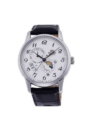 Reloj reloj orient para hombre analogo para hombre, con cristal elaborado en mineral de color blanco, el tamaño de la caja es de 42.5mm elaborada en acero inoxidable plateado, pulso negro elaborado en cuero, su movimiento es automatico, tiene resistencia al agua de 30 mts, el cierre es de hebilla y tiene 1 ano de garantia sobre maquinaria unicamente.