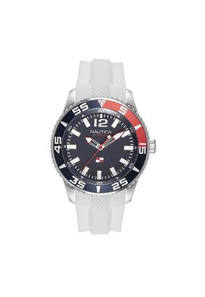 Reloj Nautica original con caja de 45mm con una funcion de movimiento, analogo su tablero es de color azul ,cristal mineral ,su caja es de color plateado en un material en acero inoxidable su pulso es en color blanco de silicona cierre en hebilla ,resistente al agua hasta 100mts y su garaantia es de 1 año sobre maquinaria unicamente
