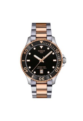 • Marca: Tissot• Modelo: T120.410.22.051.01• Colección: Seastar 1000• Genero: Hombre• Color de la caja: Plateado / Oro Rosa / Negro• Color del pulso: Plateado / Oro Rosa• Material del Pulso: Acero inoxidable• Detalles de caja: Caja circular de acero inoxidable 316L con recubrimiento PVD de oro rosaAnillo bisel mineral, Bisel giratorio en sentido antihorario, Corona y fondo de caja atornillados• Cristal: Zafiro• Diametro de Caja: 40mm• Material de Caja: Acero inoxidable• Espesor de Caja: 9.97mm• Movimiento: Cuarzo• 30 bares (300 metros)• Tipo de Cierre: Desplegable• Garantía: 24 MESES SOBRE MAQUINARIA UNICAMENTE.NO CUBRE: *Uso inadecuado por parte del comprador, Golpes y/o mala manipulación del producto. *No aplica para daños, deterioro o cambio de pulso.*No aplica para coronas y/o cristales.