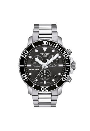 El Tissot Seastar 1000 combina estilo y rendimiento. La inspiración del buceo da forma tanto a la apariencia como a la funcionalidad de este reloj. Mantiene su rendimiento a una presión de 30 bar (300 m / 1'000 pies), combinando deportes bajo el agua y una preferencia por un sofisticado reloj suizo. El tema del buceo continúa a través de elementos como un bisel unidireccional, una correa con una hebilla de seguridad para buceadores, además de manecillas y marcas luminiscentes.Tanto a los amantes de los deportes acuáticos como a aquellos que prefieren no mojarse les complacerá saber que el Tissot Seastar 1000 Quartz Chrono, deportivo a la par que delicado, ahora está disponible en cronógrafo. Esta versión incorpora un abanico de utilidades a este reloj, cuya popularidad ha subido como la espuma. Repleto de características prácticas, el reloj se ha convertido en un accesorio acuático esencial, gracias a su hermeticidad y a su infalible movimiento de cuarzo accesible. El Tissot Seastar 1000 Quartz Chrono ofrece aún más características impresionantes y su funcionalidad queda perfectamente reflejada en el diseño del reloj. Las agujas luminiscentes permiten una fácil lectura y los índices de los minutos están grabados en la esfera hasta el 20, seguidos por una escala típica de intervalos de cinco minutos, muy útil para los buceadores. La caja y la corona roscadas protegen al reloj de los daños durante todas las aventuras submarinas de su dueño. El diseño masculino del reloj es todo un homenaje al océano con un sutil caballito de mar grabado en la caja, un guiño a las peripecias acuáticas, y el azul oscuro de la esfera, que simboliza el misterio de las profundidades marinas.