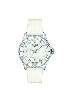 - • Marca: Reloj• Modelo: T120.210.17.116.00• Colección: Seastar• Genero: Mujer• Color de la caja: Plateado• Color del pulso: Blanco• Material del Pulso: Silicona• Cristal: Zafiro• Diametro de Caja: 36mm• Material de Caja: Acero Inoxidable• Espesor de Caja: 9.7mm• Movimiento: Cuarzo• 30 bares (300 metros)• Tipo de Cierre: Hebilla• Garantía: 24 MESES SOBRE MAQUINARIA UNICAMENTE.NO CUBRE:*Uso inadecuado por parte del comprador, Golpes y/o mala manipulación del producto.*No aplica para daños, deterioro o cambio de pulso.*No aplica para coronas y/o cristales.